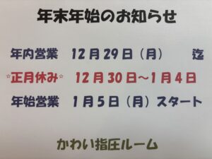 「かわい指圧ルーム」年末年始の営業日のご案内
